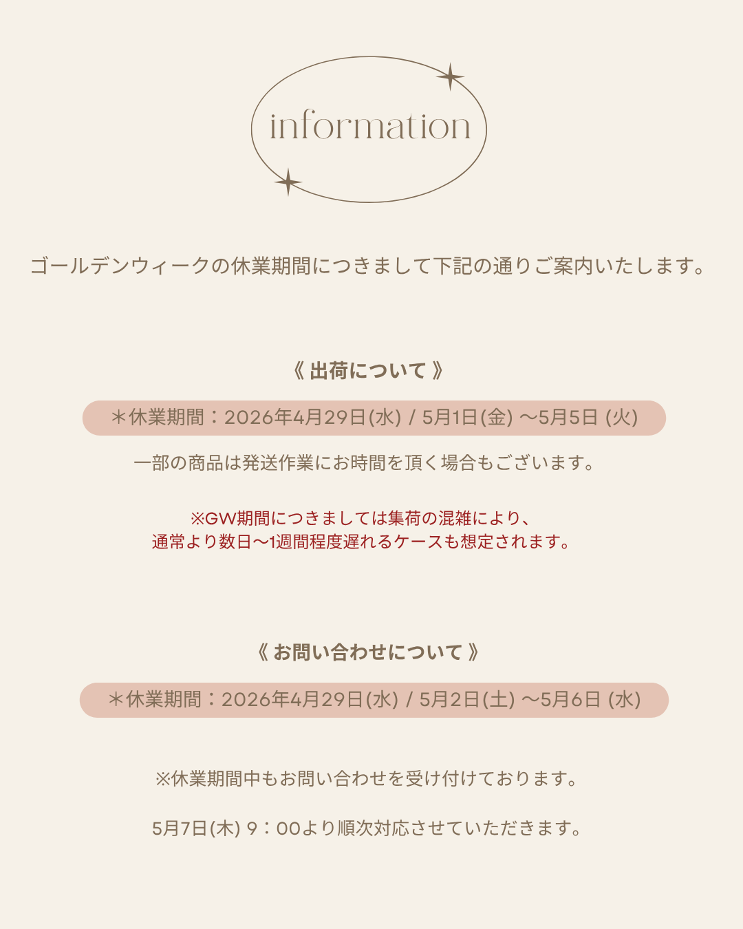 連休の前後はご注文が集中することもあり、通常よりも配送が遅れることがあります。発送までに最長半月ほどかかることもございますので、余裕をもってご注文いただけますと幸いです。