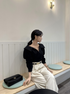 デコルテを美しく見せるクロス仕様で、女性らしい抜け感をプラス。ジャケットインにも映えるデザインで、