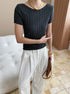 シンプルながら上品さ漂うワイドリブデザインの半袖ニットトップス。