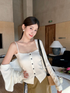 フィット感のあるキャミソールはフロントボタンでアクセントを加え、1枚でも存在感のあるデザイン。カーディガンを羽織れば上品なレイヤードスタイルが完成します。セットでも単品でも着回しが効き、デイリーからお出かけまで幅広く活躍する万能アイテムです。