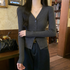 細めのリブ編みが縦のラインを強調し、すっきりとしたシルエットを演出するVネックカーディガン。