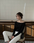 デコルテを美しく見せるボートネック寄りのオフショルデザインで、女性らしさと抜け感を両立。