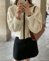 立体感のある編地に、縁取りのコントラストラインと品良いゴールドボタンを添え、どこかレトロで上品なムードを演出します。