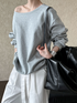 程よいゆるさと抜け感を演出するオフショルダー風スウェットトップス。柔らかなコットン混素材で着心地抜群。肩を落としたリラックスシルエットが大人のラフコーデにぴったり。パンツにもスカートにも合わせやすく、デイリーからお出かけまで幅広く活躍します。