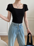 デコルテを美しく見せてくれるスクエアネックに、フィット感のあるリブ素材が女性らしさを引き立てるトップス。