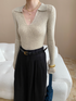 深めのVネックに小さめの襟をプラスした、クラシカルな印象のリブニットトップス。
