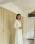 デコルテを美しく見せるVネックデザインと、フロントのリボンディテールがさりげないアクセントになり、甘さの中に大人の落ち着きを感じさせます。