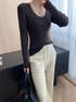 デコルテをきれいに見せる開き具合と、程よく身体にフィットするリブ素材で美しいシルエットを演出します。